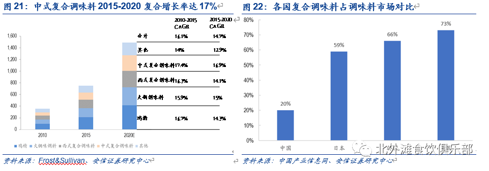 2)中式复合调味料:当前中国复合调味料市场渗入率较美日发财国度仍低,受益于家庭小型化、烹调门槛降低趋向和餐饮尺度化提拔,估计也能维持双位数增加。中国复合调味的市场规模从2013年的557亿元增加到2018年的1091亿元,复合增加率为14。4%,正在调味料市场中的占比从2015年的18。2%提拔到18年的20%,但取其他发财国度比拟仍有差距,日本、韩国和美国的复合调味料占比调味料接近六成及以上。按照沙利文数据,2020年中国复合调味料市场估计达到1488亿元的规模,沙利文将复合调味料具体细分为五个品类:鸡精、暖锅调味料、中式复合调味料、西式复合调味料及其他。公司已结构的两类复合调味料,即暖锅调料和中式复合调料,正在2018年平分别占复合调味料规模的21%和17%。