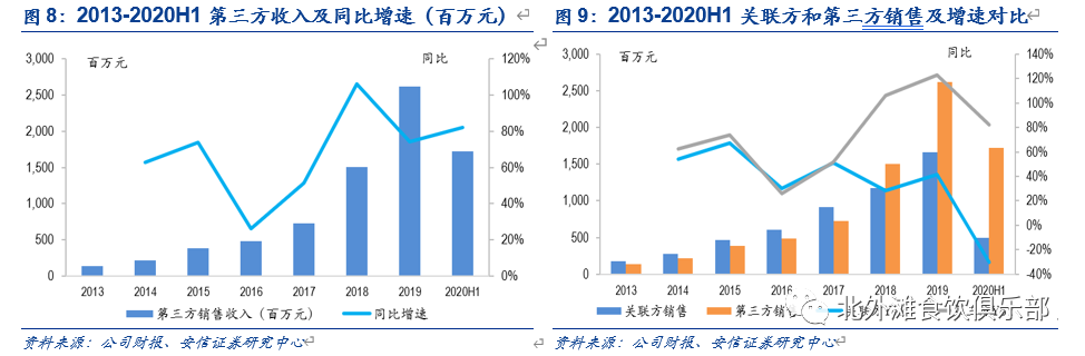 三季度末海底捞采用取第三方厂商市场化比价准绳从头梳理底料采购,对产物布局进行调整从而优化成本,这使得颐海国际(01579)联系关系方营业供货价钱和毛利率自20H2起头有所承压,市场预期对20H2公司联系关系方营业收入增加和利润贡献进行调整,股价自前期高点回调幅度达到30%。目前海底捞采购量90%仍然来自颐海国际,可是陪伴品类添加会按期向第三方供货询价,将来疑惑除该比例和联系关系方供货价钱稳中微降。安信证券认为联系关系方市场化订价会反向鞭策公司提超出跨越产运营效率,为将来开展其他B端营业奠基更好价钱根本,别的近年来公司联系关系方占总收入比从2017年56%降至2019年39%,第三方营业实现了快速增加,由多品类驱动,市场该当更多聚焦公司2C营业产物立异打开市场空间和渠道拓展能力。