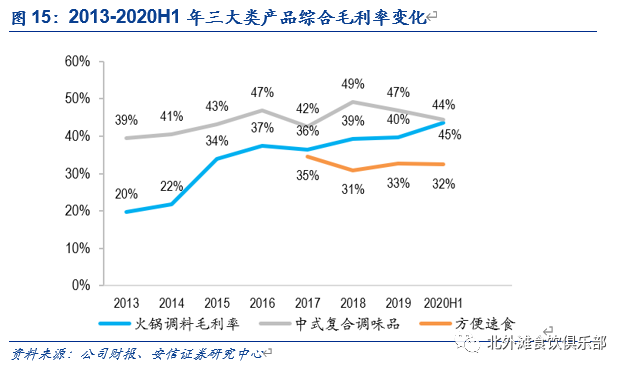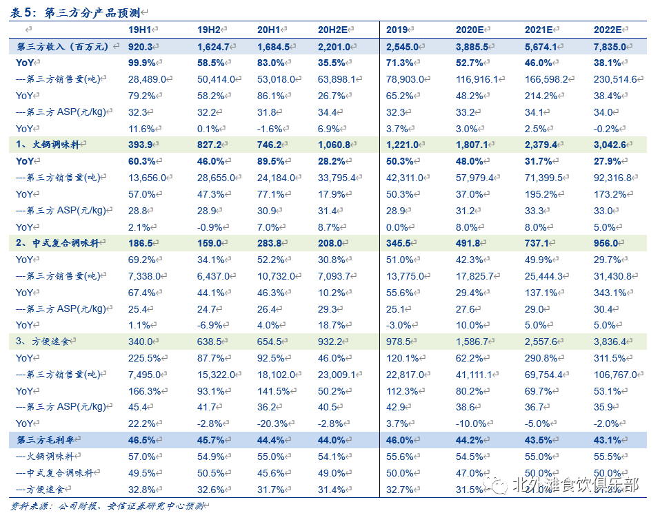 同时安信证券估计第三方毛利率20H2同比下滑至44%,次要由于低毛利率冲泡系列和小暖锅占比添加,2020全年第三方毛利率下滑至44。2%,2021和2022年第三方毛利率为43。5%和43。1%。安信证券估计暖锅调味料第三方毛利率2020/2021/2022年别离为54。5%/55%/55。5%,中式复合调味料第三方毛利率2020/2021/2022年别离为47%/50%/50%,便利速食第三方毛利率2020/2021/2022年别离为31。5%/31%/31。5%。