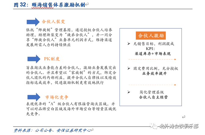 2019年正式引入海底捞师徒制,组织裂变。由于分歧地域经销商数量分歧,部门发卖人员要担任10+个经销商,如许大幅降低办事质量和效率,于是公司2019年正式引入海底捞的“师徒制”,组织裂变,即发卖人员(师傅)可自行聘请发卖帮理(门徒),并担任培训和领取其薪酬。因为海底捞培训门徒的店长颠末层层选拔而颐海发卖人员层级较为扁平,为师傅质量,公司2016年起头精简发卖步队,对合股人进行查核分为A/B/C品级,只要评定合股人才可自行聘请门徒。同时合股人能够优先接管裁减区域,并能够对品牌空白区域及海外市场空白区域等增量市场优先合作。