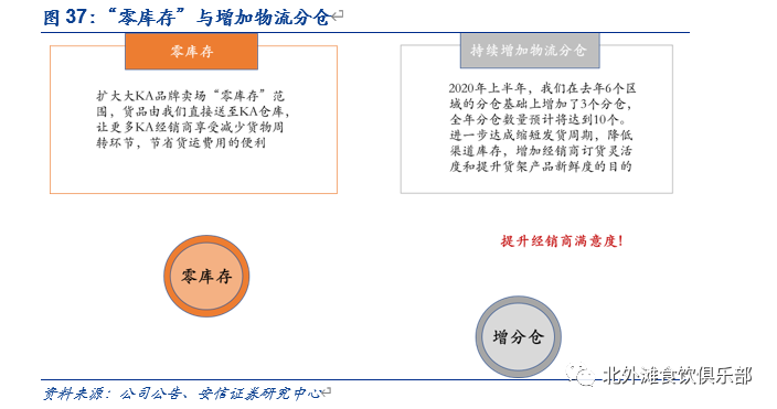 20H1公司继续通过添加物流配送分仓提拔物流效率,提拔经销商对劲度。公司上半年添加了三个区域物流分仓,目前区域分仓数量达到九个,2020年下半年还将添加至十个。该行动可帮帮公司缩短发货周期,提拔经销商订货矫捷度,并无效降低渠道库存程度,渠道健康可控。渠道效率提拔的同时亦可提拔货架产物新颖度,使产物陈列的结果更佳。为了进一步优化沉点客户(KA)陈列及发卖,公司继续扩大卖场“零库存”实施范畴。“零库存”是指货色间接由公司的分仓运送至大卖场仓库,以削减物流节点,节流配送费用,削减货色周转时间。实现了对特定经销商激励提拔,同时达到卖场商品新颖度的优化。目前已有多个品牌大卖场经销商可享受“零库存”曲送待遇,而且已扩展到个体电商平台客户。