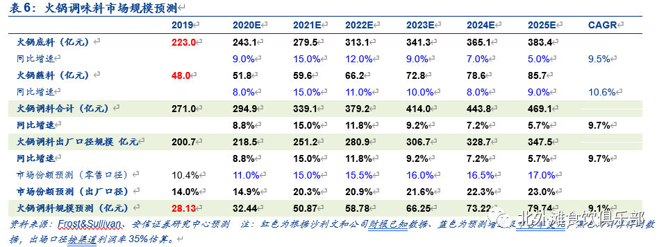 安信证券也按照对暖锅调味料行业增速、市场份额的预测对颐海将来暖锅调味料营业的发卖规模做了测算,估计暖锅调味料行业零售额2022-2025年复合增速达到9。7%。