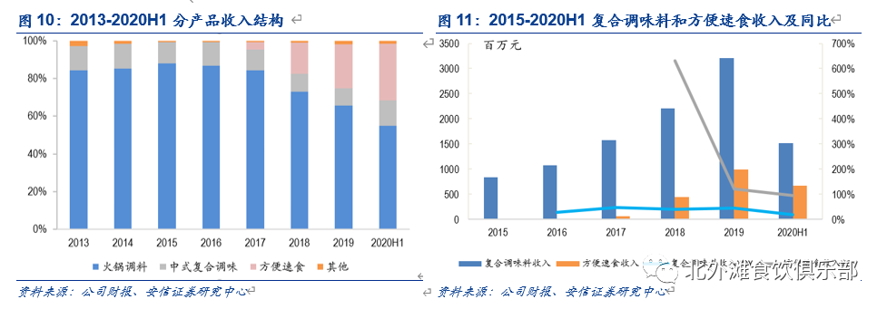 2020上半年,公司2B营业联系关系方海底捞因卫生事务影响关店而导致业绩下滑,暖锅底料产物来自联系关系方的收入同比下滑32%至4。69亿元,占暖锅调料比从63。8%降至38。6%。相反,第三方营业受益于卫生事务下居家消费增加,同时加快了便利速食和复合调味品的消费者教育,暖锅底料产物来自第三方收入上升至7。46亿元,同比增89。5%,占暖锅调料比从36。2%增至61。4%。同时公司旗下多款2C产物好比便利速食、中式复合调味料等表示亮眼,卫生事务下第三方便利速食、中式复合调味料2020H1收入别离为6。5亿元和2。8亿元,别离同比增92。5%和52。2%。