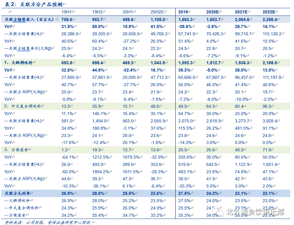 按照对海底捞和颐海国际近期动态变化对根基面的影响,安信证券对颐海国际20H2和2021年联系关系方收入和业绩预测做出如下预测:安信证券估计受联系关系方调价影响,20H2联系关系方营业总收入同比增16%至11亿元,全年联系关系方总收入估计仍有低单个位数下滑,安信证券预测或达到约16亿元,2021年正在上半年联系关系方收入低基数下估计全年联系关系方收入同比增接近30%达到约21亿元,2022年同比增14%至23。6亿元。这此中安信证券预测暖锅调味料联系关系方收入20H2同比增16%至10。4亿元,2020全年收入同比下滑5%至15。1亿元,2021和2022年别离同比增28%和13%。