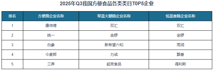 细分企业来看,便利面方面,2025年Q3便利面类目标前五集团由康师傅、同一、白象、今麦郎和三养构成,市场份额合计85。15%;常温火腿肠方面,常温火腿肠的前五集团别离为双汇、金锣、新但愿六和、合计市场份额占到93。37%;低温腊肠方面,低温腊肠类目TOP5集团别离为双汇、金锣、雨润、飘喷鼻和得利斯,市场份额合计71。53%。