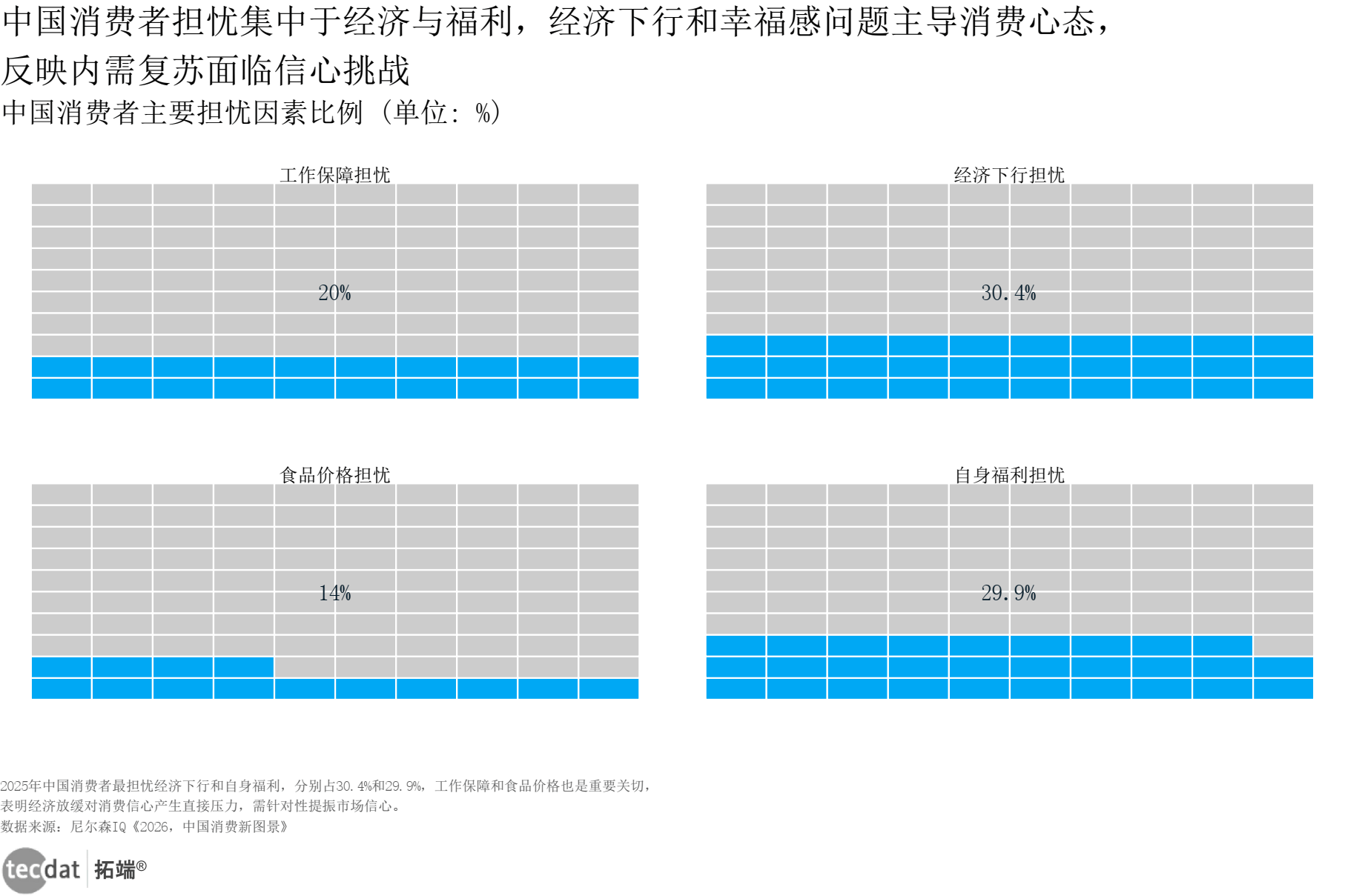 3秒解读:30。4%消费者担心“经济下行”,29。9%担心“本身福利”(如医疗、养老),两者合计近六成,远超“工做保障”(20%)和“食物价钱”(14%),申明“宏不雅经济决心”是影响消费决策的焦点变量。