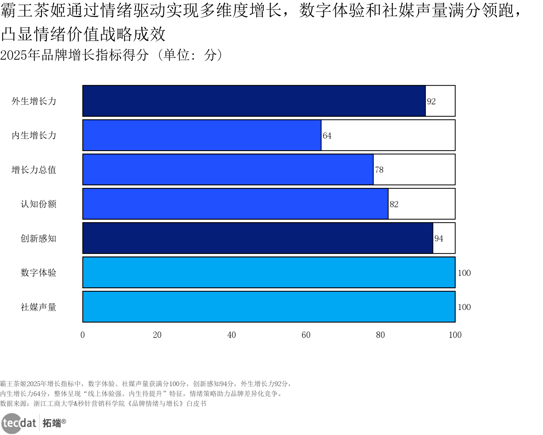 3秒解读:7个增加目标中,数字体验、社媒声量拿满100分,立异94分、外生增加力92分,仅内生增加力64分待提拔,清晰呈现“线上体验强、内部效能需补”的当前款式,也为同类品牌供给了优化标的目的。
