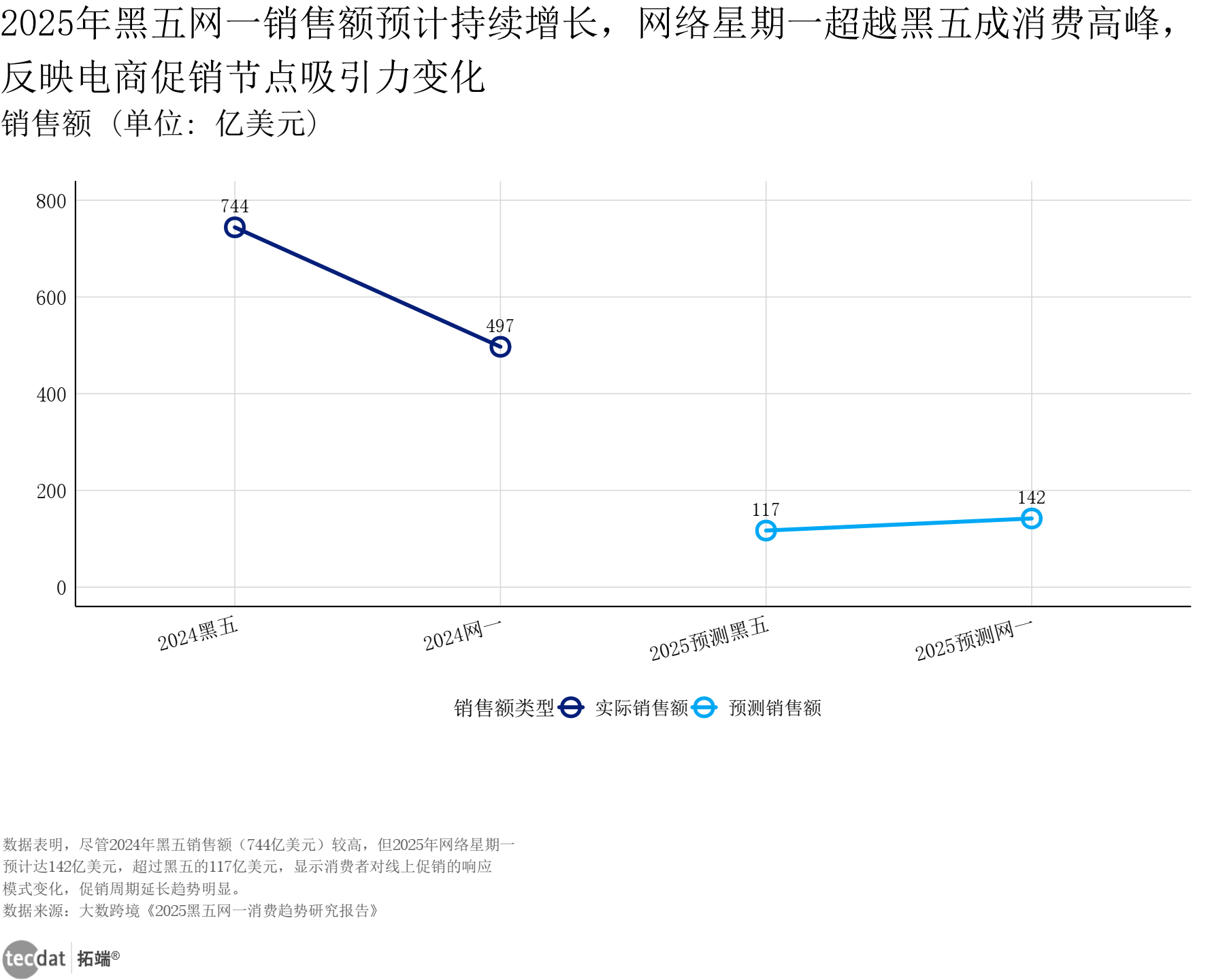 黑五网一发卖额趋向折线亿美元;2025年预测黑五117亿美元,网一142亿美元,网一初次超越黑五,线上大促的吸引力持续加强,消费者更倾向于“线上比价、集中下单”。