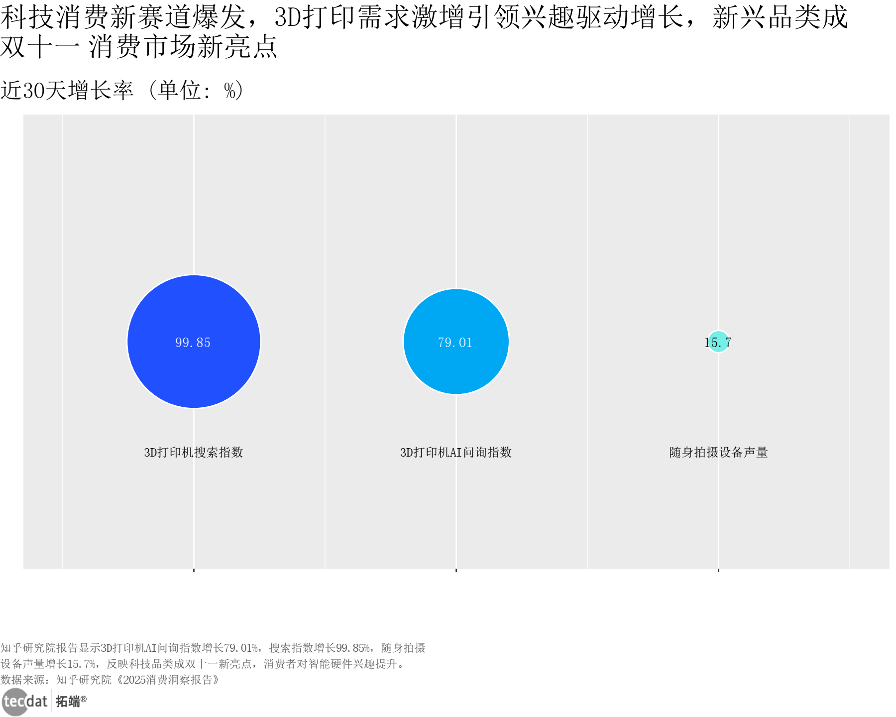 3秒解读:3D打印机搜刮指数增加99。85%,AI问询指数增加79。01%,随身拍摄设备声量增加15。7%,3D打印的迸发式增加远超其他品类,反映消费者对“个性化创制”的需求提拔。