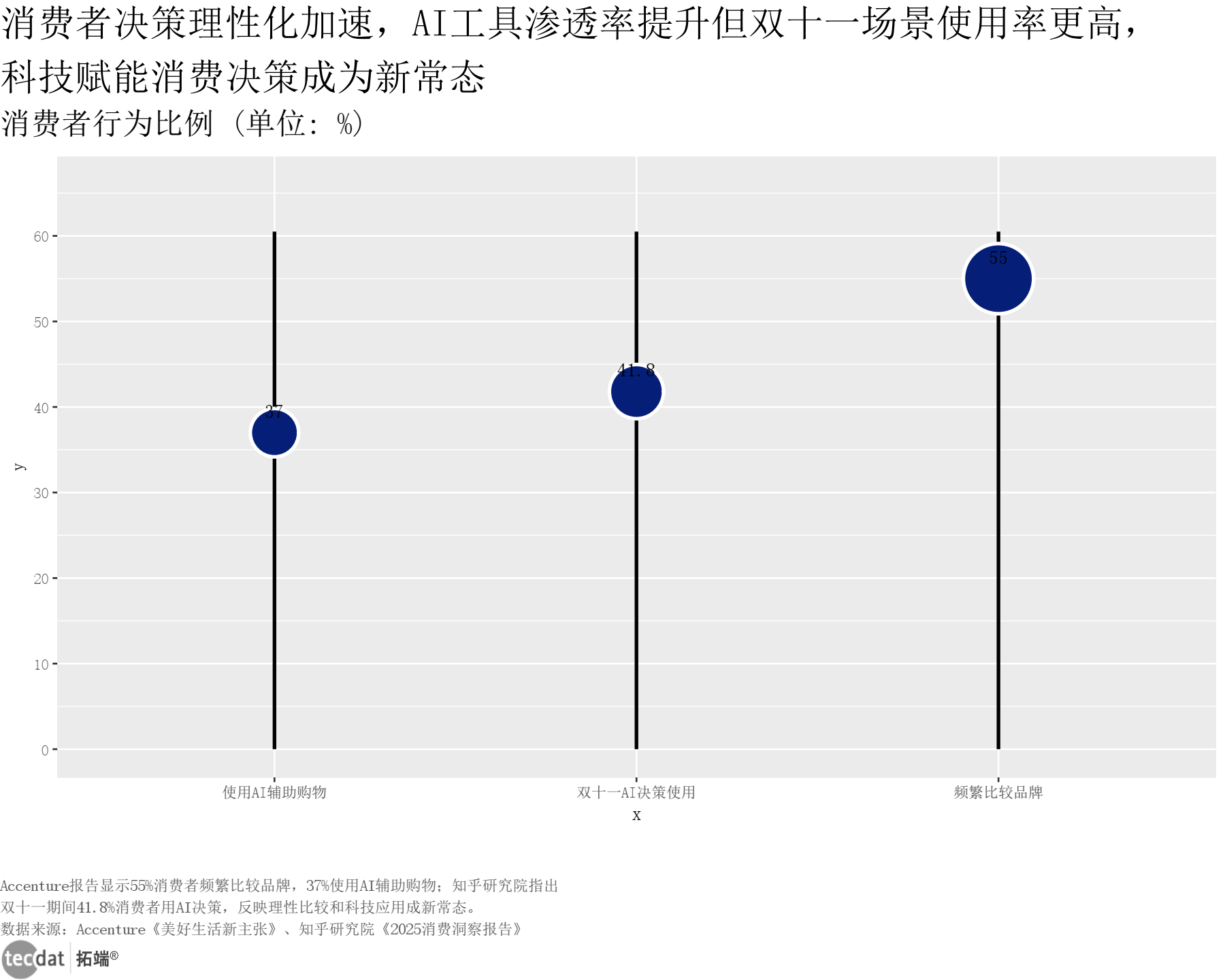 核论演讲名称及数据数据差别缘由阐发消费者利用AI辅帮购物比例Accenture《夸姣糊口新从意》:37%;知乎研究院《2025消费洞察演讲》:无间接数据,但双十一AI决策率41。8%日常AI利用率(37%)低于双十一场景(41。8%)时间周期分歧:双十一属于“高决策成本场景”,消费者更愿用AI简化决策;日常购物决策简单,AI利用率低消费者屡次比力品牌比例Accenture《夸姣糊口新从意》:55%;其他演讲无间接数据仅Accenture有此数据统计范畴分歧:Accenture笼盖全品类消费场景,其他演讲聚焦大促、食物等细分场景,未涉及全品类比价行为!