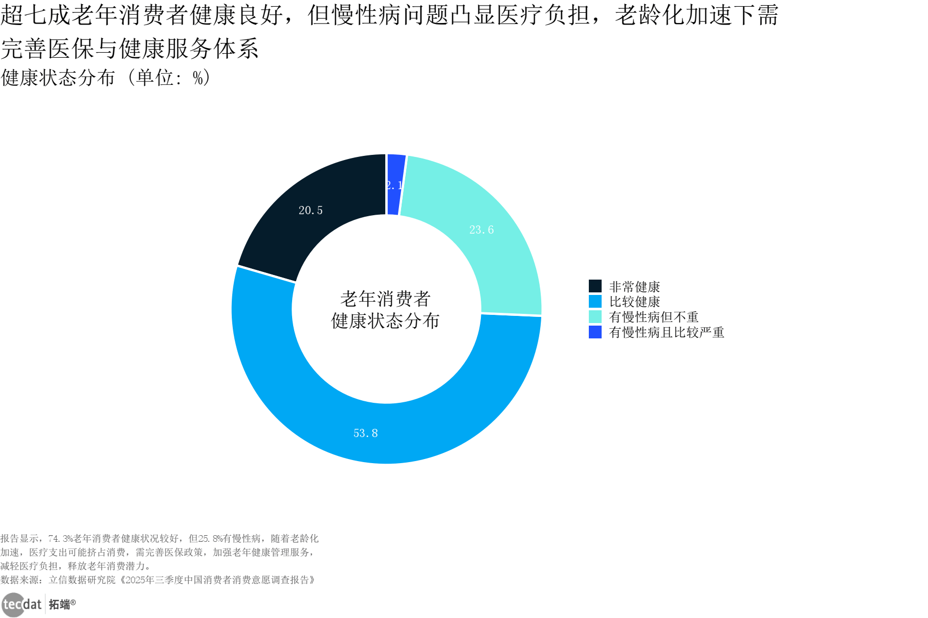 3秒解读:20。5%老年消费者“很是健康”,53。8%“比力健康”,两者合计74。3%;23。6%有慢性病但不沉,2。1%慢性病严沉,申明“健康白叟”是老年消费的从力,但慢性病群体的医疗收入会挤占其他消费预算。