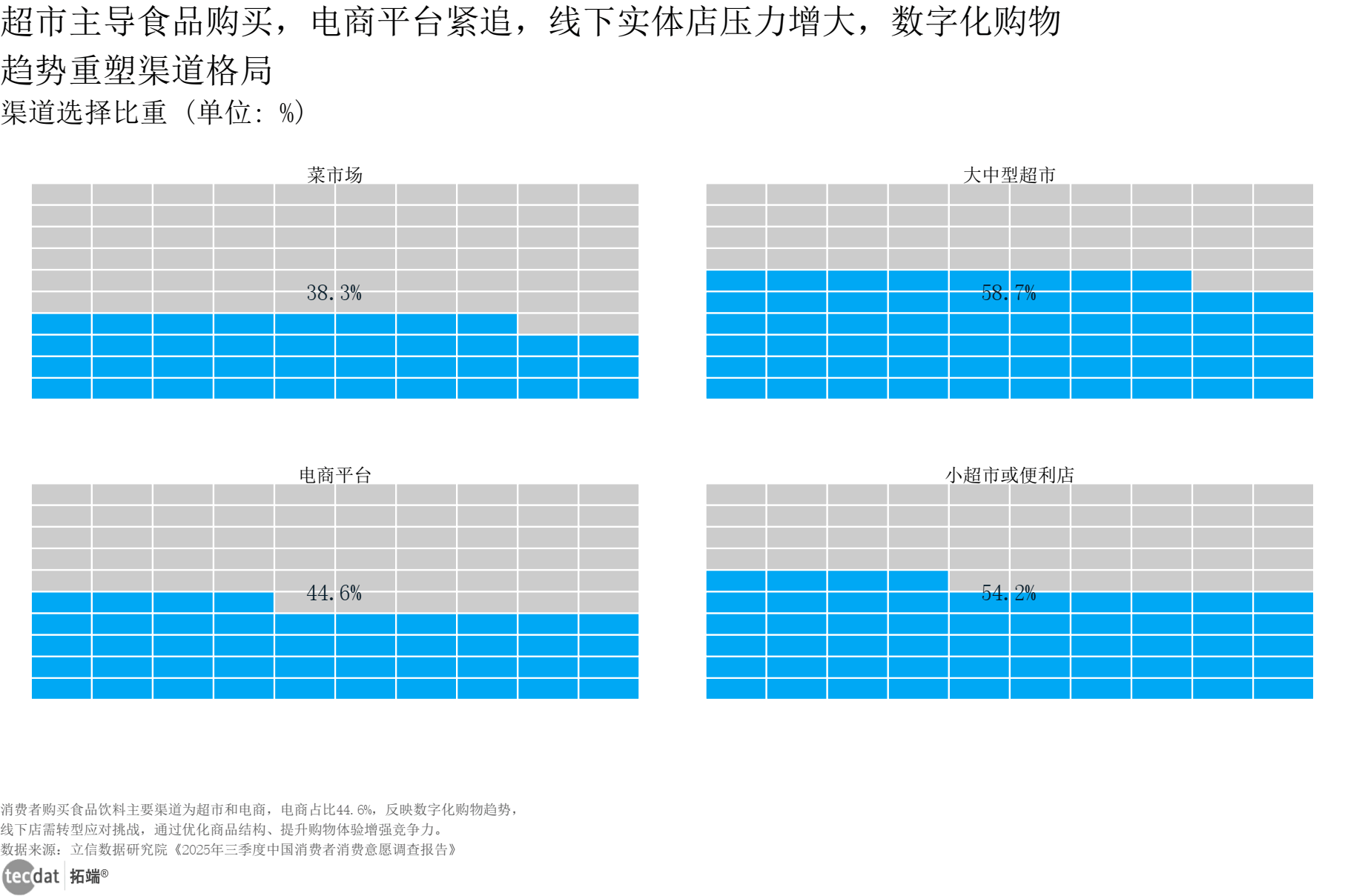 3秒解读:58。7%消费者选大中型超市,54。2%选小超市/便当店,44。6%选电商平台,38。3%选菜市场,超市和便当店的“立即性”劣势较着,电商则靠“配送便利”快速兴起,渠道合作愈发激烈。