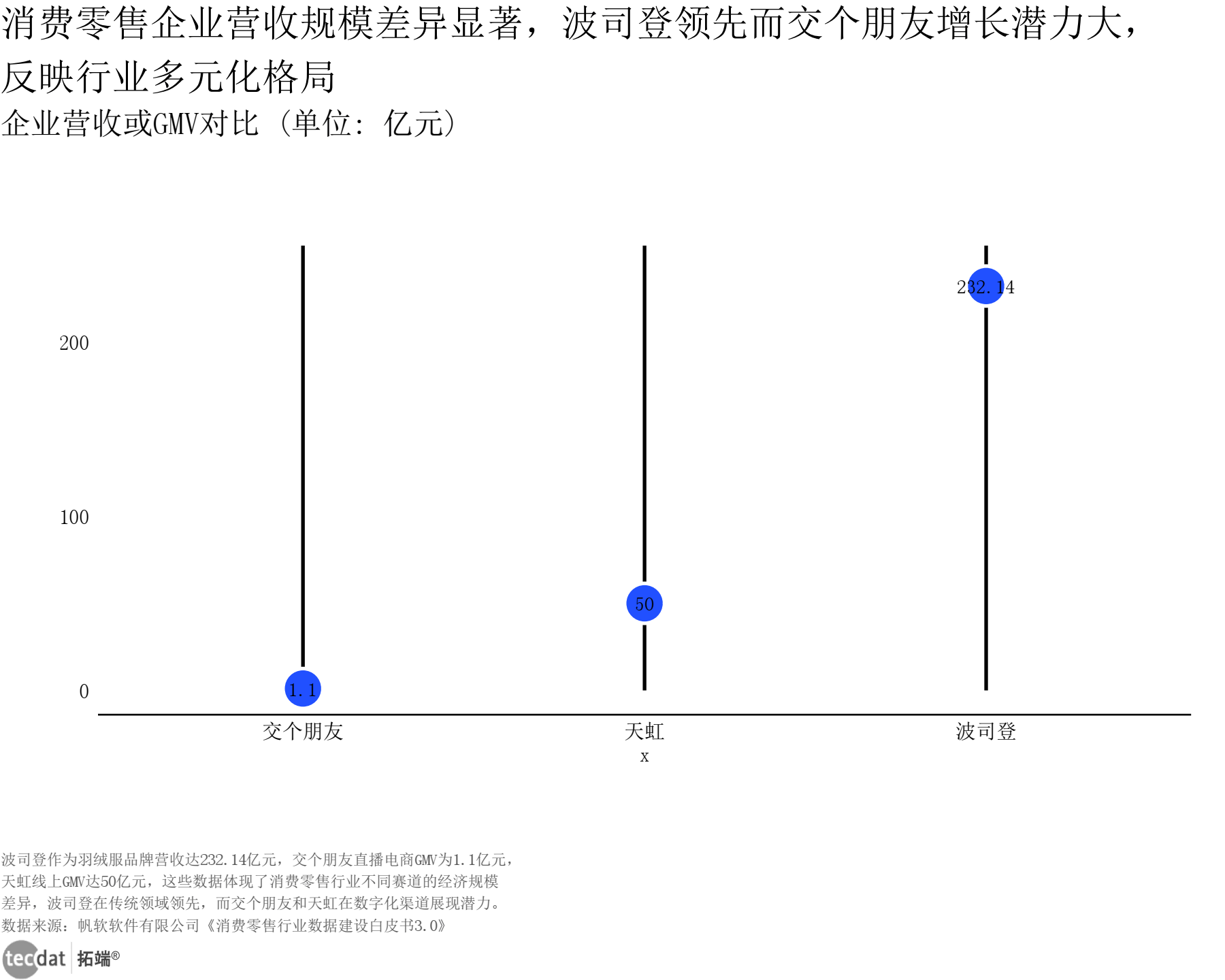 消费零售企业营收规模对比刻度线亿元营收坐稳保守实体龙头(靠品类深耕+线亿元线上GMV表现“线下+线上”融合的转型成效,交个伴侣1。1亿元GMV则代表曲播电商“轻资产、快周转”的新兴赛道属性,三者差距并非源于运营能力,而是赛道素质差别。