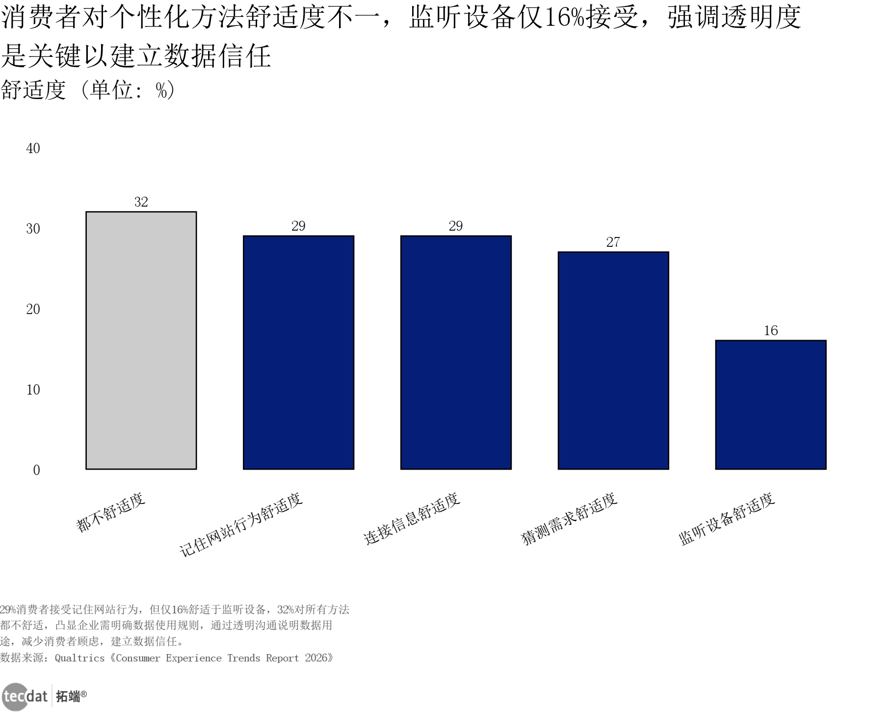 3秒解读:32%消费者对“所有个性化方式都不舒服”,29%接管“记住网坐行为”,仅16%接管“设备”,申明“数据利用体例越荫蔽,消费者越反感”,通明化是环节。