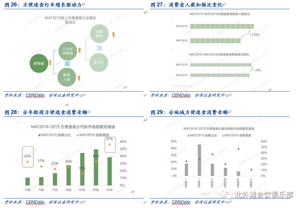 2019年便利速食行业成长次要由消费者人群规模和消费频次驱动,天猫统计MAT2019年便利速食消费人群同比增126%,消费者频次同比增6%,从消费人群地舆来看,这此中二线城市用户是次要消费群体,三线及以下城市消费增速快;从消费人群春秋段来看,85-90后消费者贡献近五成消费金额,95后消费规模正正在赶超85后,是将来增加的高价值人群。