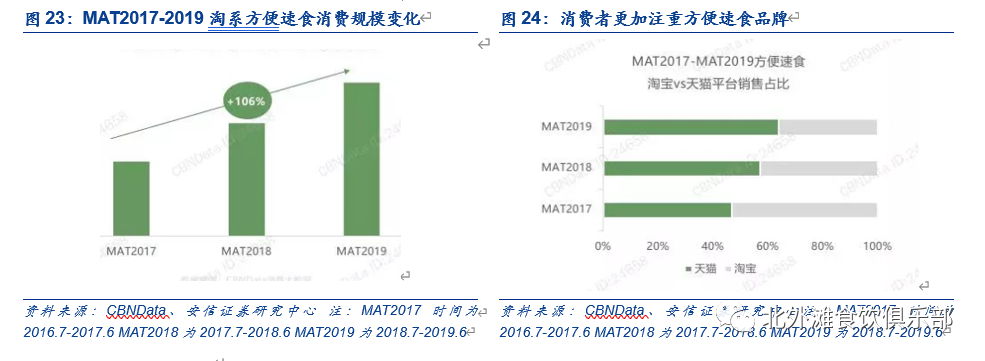 近三年线上便利速食消费规模持续扩大,MAT2019年淘系便利速食行业消费规模较2017年增加106%,此中天猫平台相对淘宝占比不竭提拔,MAT2019年占比达到约六成,能够看到消费者品牌消费认识加强,虽然便利速食行业品牌矩阵愈加多元化,可是品牌力较强的保守品牌仍然占领从导地位,新兴品牌加快上线。