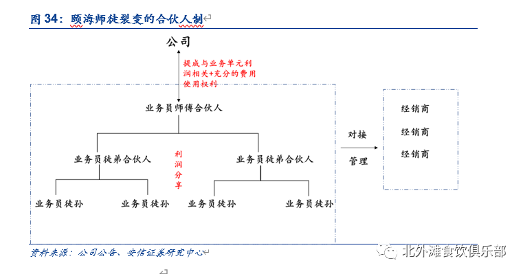 2019年正式引入海底捞师徒制,组织裂变。由于分歧地域经销商数量分歧,部门发卖人员要担任10+个经销商,如许大幅降低办事质量和效率,于是公司2019年正式引入海底捞的“师徒制”,组织裂变,即发卖人员(师傅)可自行聘请发卖帮理(门徒),并担任培训和领取其薪酬。因为海底捞培训门徒的店长颠末层层选拔而颐海发卖人员层级较为扁平,为师傅质量,公司2016年起头精简发卖步队,对合股人进行查核分为A/B/C品级,只要评定合股人才可自行聘请门徒。同时合股人能够优先接管裁减区域,并能够对品牌空白区域及海外市场空白区域等增量市场优先合作。