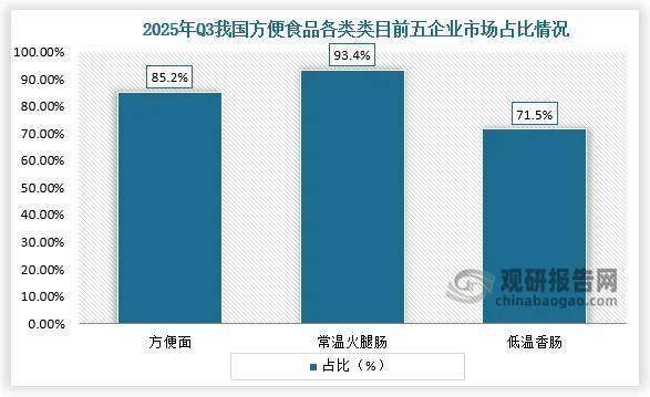细分企业来看,便利面方面,2025年Q3便利面类目标前五集团由康师傅、同一、白象、今麦郎和三养构成,市场份额合计85。15%;常温火腿肠方面,常温火腿肠的前五集团别离为双汇、金锣、新但愿六和、合计市场份额占到93。37%;低温腊肠方面,低温腊肠类目TOP5集团别离为双汇、金锣、雨润、飘喷鼻和得利斯,市场份额合计71。53%。