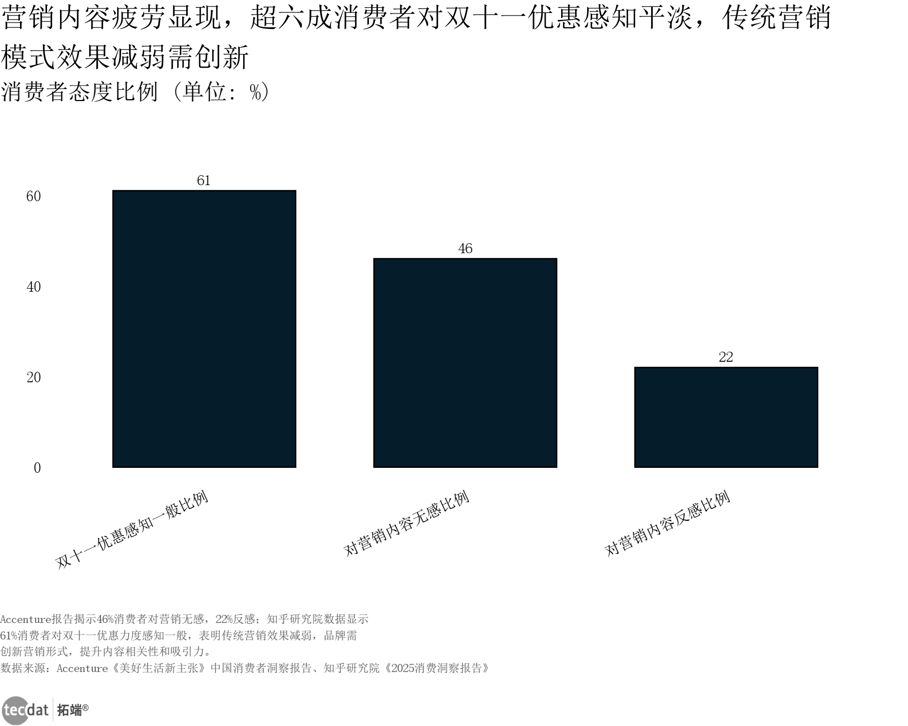 3秒解读:61%消费者对双十一优惠“一般”,46%对营销内容“无感”,22%以至“反感”,数据申明“硬广”结果持续下滑,消费者更青睐“有场景、有温度”的内容。