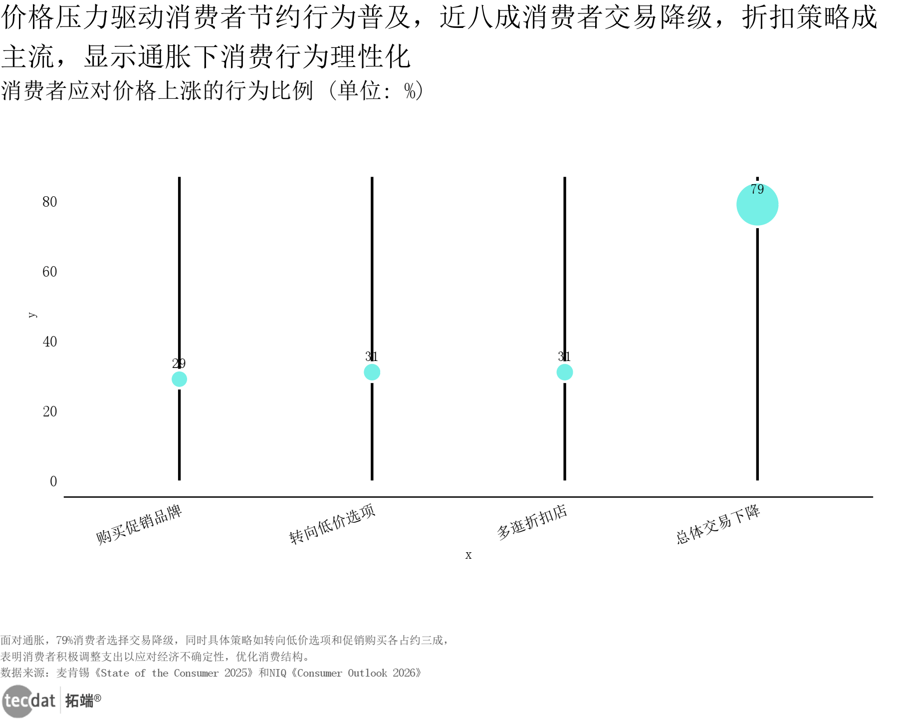 3秒解读:79%消费者会选择“总体买卖下降”(如少买1件、选廉价款),31%转向低价选项,30%专买促销品,数据清晰显示“扣头”是当前最无效的消费刺激手段,消费者对价钱的度显著提拔。