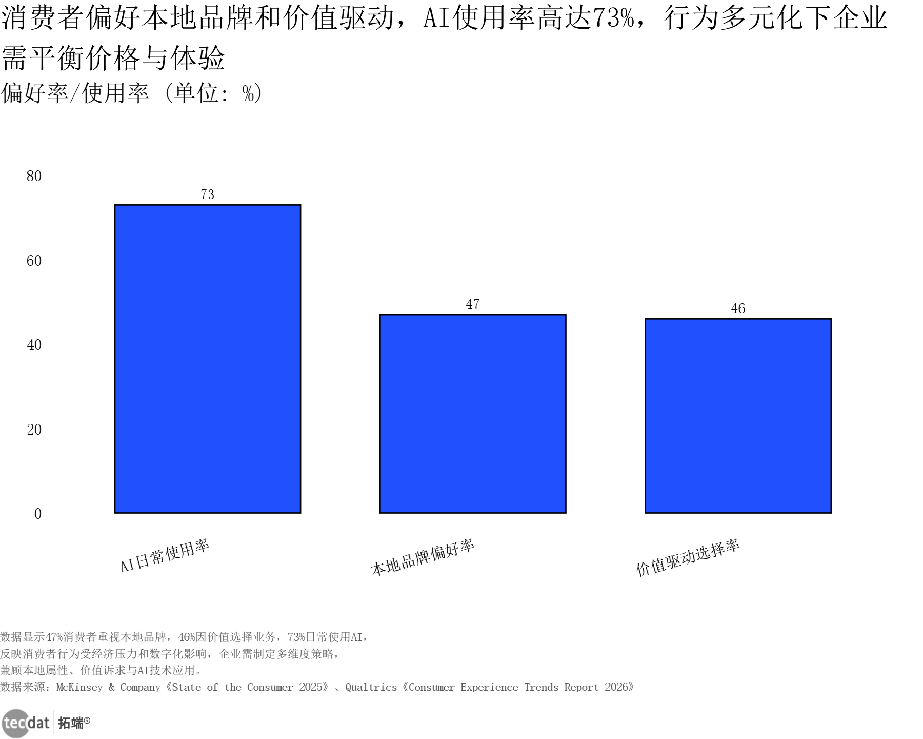 3秒解读:73%消费者日常用AI,47%偏好当地品牌,46%因“价值认同”选择营业,申明“AI利用习惯”取“当地偏好、价值逃求”并不冲突,消费者会分析多要素做选择。