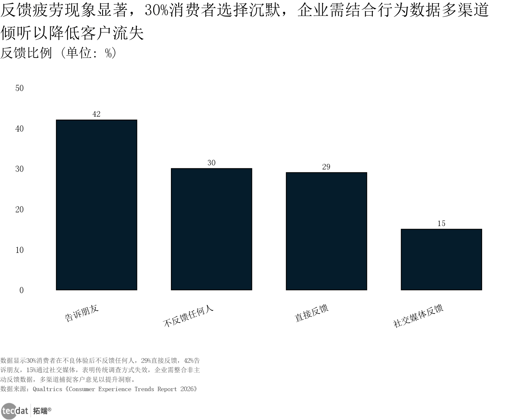 3秒解读:42%消费者会“告诉伴侣”(激发口碑),30%“不反馈任何人”(现性流失),29%“间接反馈”,15%“社交反馈”,申明“口碑影响”比“间接赞扬”更遍及,企业容易错过负面消息。