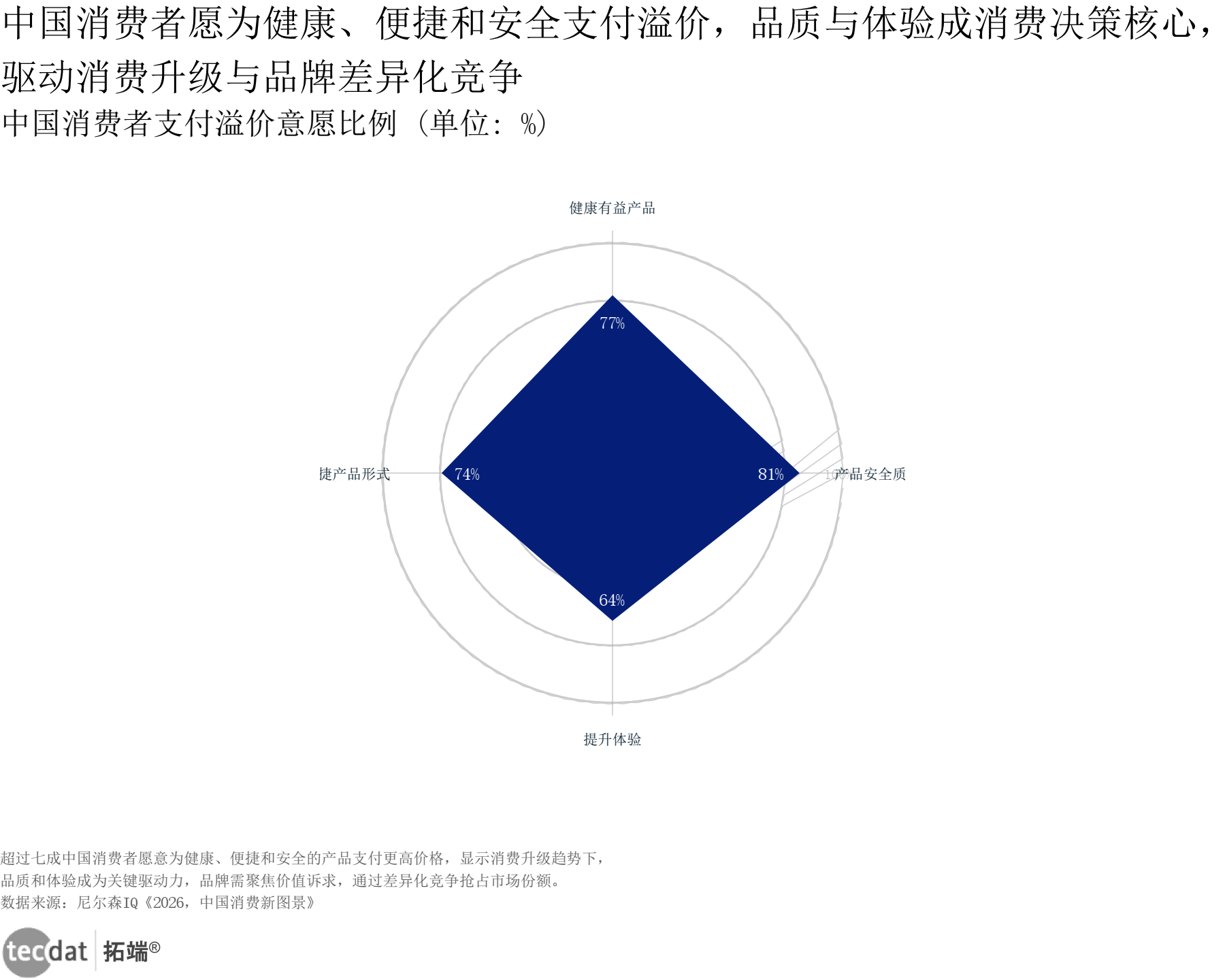 3秒解读:81%消费者愿为“产物平安质量”付费,77%为“健康无益产物”买单,74%看沉“便利产物形式”,仅64%为“提拔体验”付费,数据明白表白“适用属性”比“感情体验”更能打动消费者掏高价。
